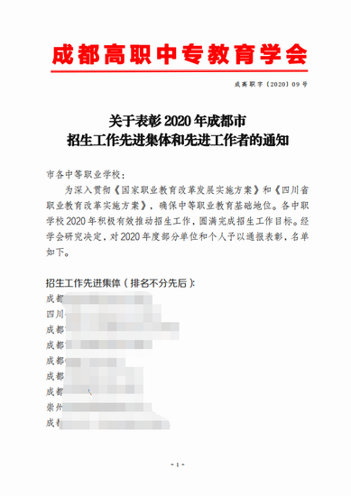 ——我校获2020年成都市招生工作先进集体荣誉称号