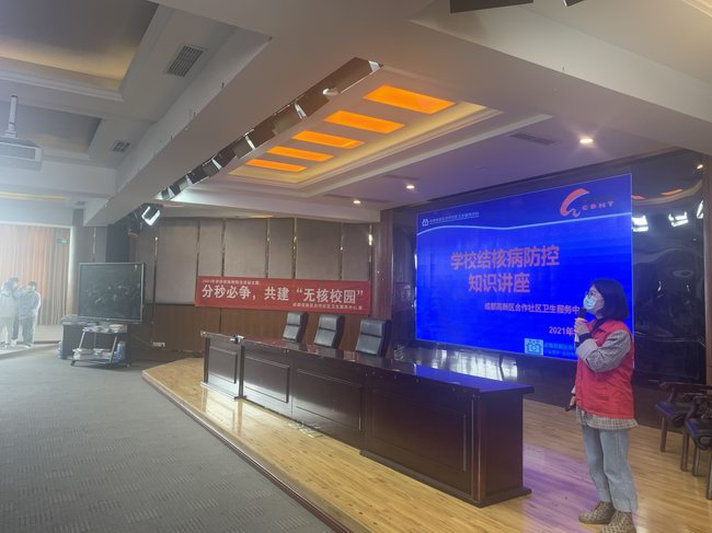3月24日是第26个“世界防治结核病日”,为全面贯彻习近平总书记关于健康中国战略重要论述精神,引导师生树立正确健康观念,进一步提高学校健康教育质量和师生健康素养,我校于3月16日下午邀请成都高新区合作社区卫生服务中心工作人员到校举办以“分秒必争,共建无‘核’校园”为主题的预防结核病知识宣传讲座,全校200余名师生代表参加了讲座。