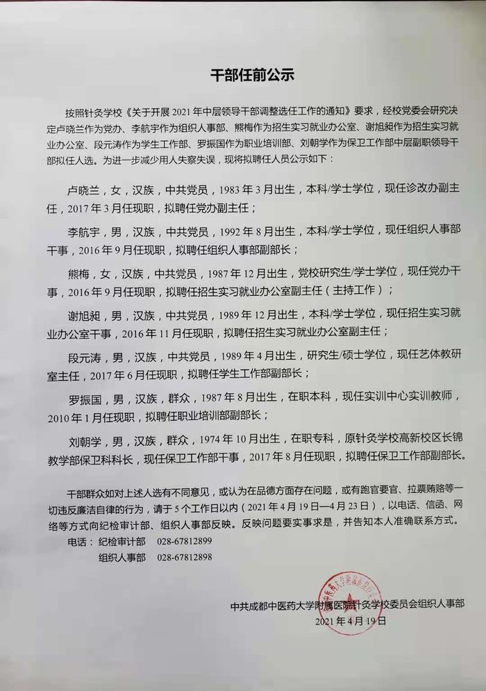 党办、组织人事部、招生实习就业办公室、学生工作部、职业培训部、保卫工作部中层副职领导岗位拟任人选任前公示
