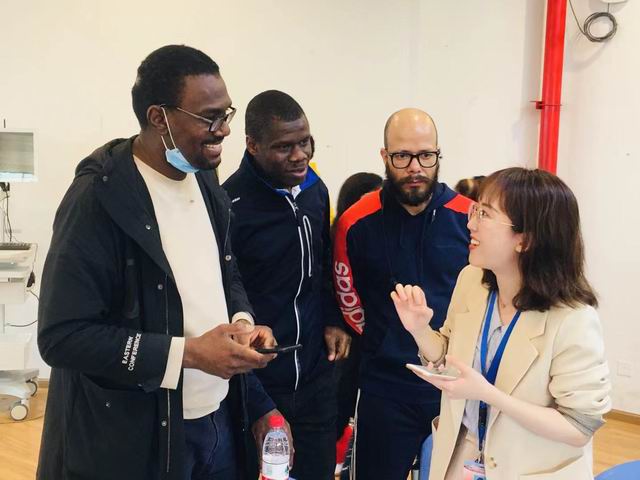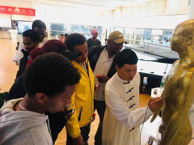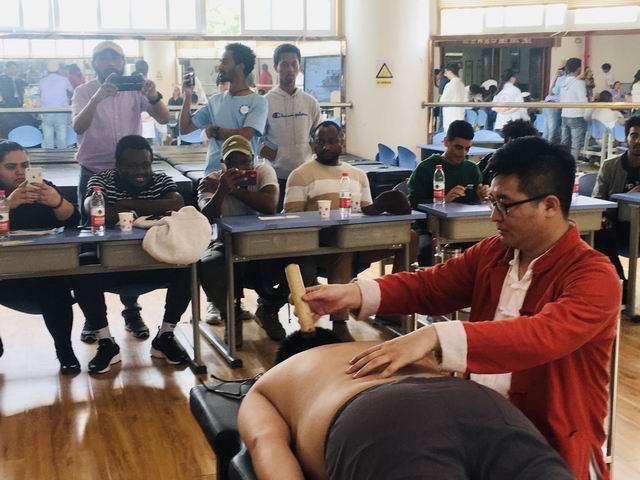 中医康复教研室教师李慧(中医康复保健专业国际班班主任)带来了中医养生文化全英文分享课,讲授了食疗养生、保健养生及中医药助力防疫等内容。艺体教研室主任段元涛教授了健身气功八段锦“双手托天理三焦”、“左右开弓似射雕”等动作。技能大师工作室负责人杜本贵、罗振国分别演示了推拿按摩手法及火罐技术,并开展了中医药服务体验项目。