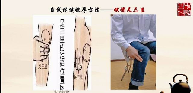 此穴为强壮保健要穴。自我保健按摩时,身体前倾,用食中二指做环形按揉,既可顺时针揉,也可逆时针揉。左右各按揉30余次。可起到补脾健胃、调和气血的作用。在结束按揉后,也可双手握拳进行叩击。同时足三里穴也具有补中益气、健脾和胃的功效,故为调摄虚劳诸症的要穴。