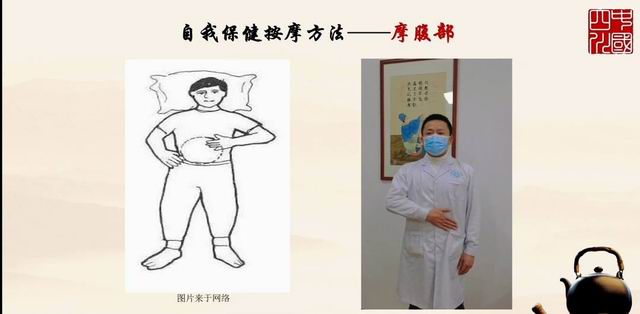 摩腹是一种古老的按摩手法之一,操作简便,受众面广泛??善轿杂诖采希匀缓粑?,意守丹田,以肚脐为中心,将手掌着力,贴于腹部体表,逐渐增大按摩范围,进行顺、逆时针摩动,各摩动36次,以发热为度【切回】。腹部是气血生化之所,摩腹既可消食导滞、调节胃肠不适,防治脾胃诸疾,又可培植元气,使气血生化机能旺盛,而起到防治疾患的作用。