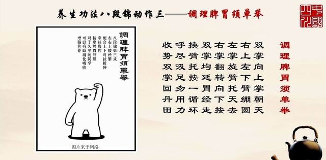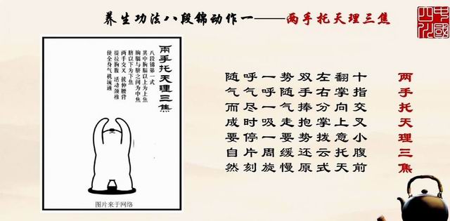 起源于北宋(960年-1127年),至今有一千年的历史。古人把这套动作比喻为“锦”意为五颜六色,美而华贵!体现其动作舒展优美,具有祛病健身、强身、养生作用,由于编排精致,动作优美,分为八段,故名“八段锦”。因练习无需器械,不受场地天气限制,简单易学,老少皆宜;具有轻柔和缓,圆活连贯,松紧自然,动静结合,形与神俱,气与意合等特点。