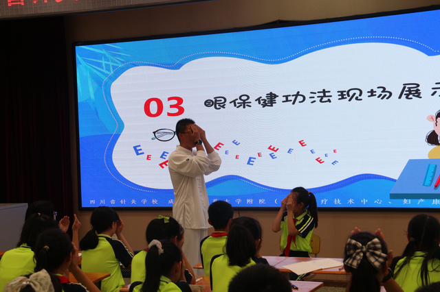 “眼睛是心灵的窗户,可以感知美,可以认知世界,可以发现奥秘,可以探索未来。只要同学们眼底有光,就会燃起希望之火,生命就会生生不息,人生就会‘睛’彩不断!”,张美林运用生动的语言、丰富的事例分享,从眼保健的中医知识,中医论眼的生理功能、生理联系等方面娓娓道来,并从眼睛保健、眼保健操、眼保健食谱等方面对眼保健的方法作了深入浅出地讲解。针灸学校教师段元涛现场教授了学生健身气功·明目功(青少版)?!爸幸揭┱娴暮糜腥ぐ?!”六年级2班学生郑武岳兴奋地说。课堂以互动体验的形式让孩子们感受到中医药文化的独特魅力,知识性与趣味性完美结合。