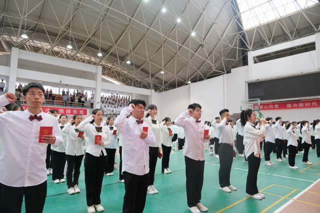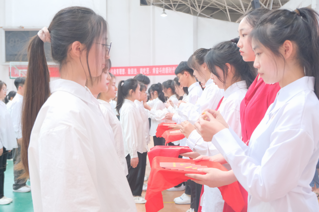 在庄严的团旗下,学校优秀团员代表为新团员佩戴团徽、颁发团章。校团委先海睿同学带领新团员进行宣誓,团员们铿锵有力的誓言响彻全场。