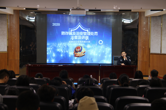 为增强我校师生法律意识,提高安全防范能力,营造平安、文明、和谐的校园氛围, 2020年10月30日下午,保卫科邀请合作街道派出所肖德龙副所长、刁坤、张本恭警官一行到我??拱踩敕ㄖ平逃沧?,学校副校长刘华云、保卫科科长、信息科科长、保卫科、信息科、班主任、各科室安全员、各班级代表共200余人参加本次讲座。