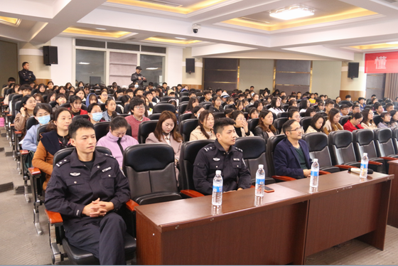 刁坤警官结合辖区相关学校及单位的真实案例,从电信诈骗、助学金诈骗、网络赌博、刷单返利等现阶段常见的诈骗方式,深入浅出地为师生分析讲解了犯罪分子的作案手段及其应对方法。