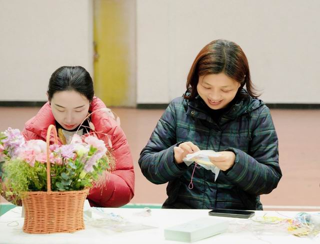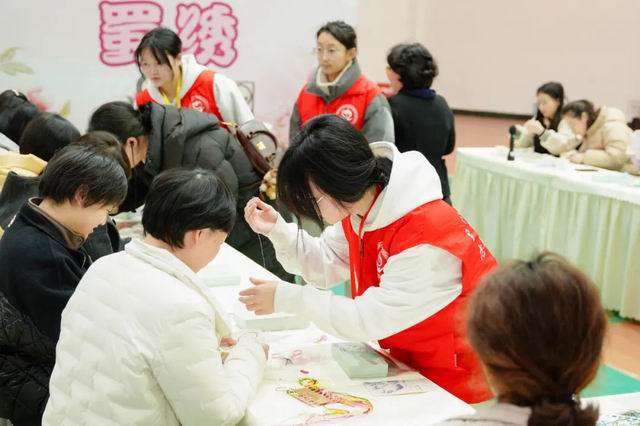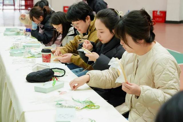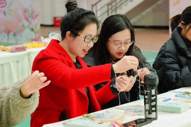 在专业蜀绣师的指导下,女教职工们穿针引线,在素色锦缎上绣制花、鸟等图案。一针一线间,传统技艺与现代教育精神交织,彰显了女教职工“刚柔并济”的文化底蕴与匠心精神。