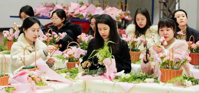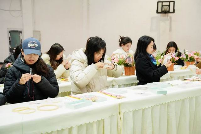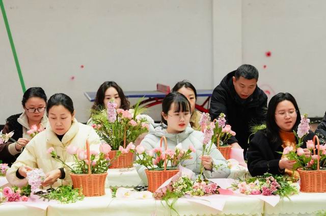 在专业花艺师的指导下,女教职工们以春日为主题,充分发挥艺术创造力,从选材、修枝到造型,以花枝为笔勾勒出对美好生活的向往。素手翻飞间,玫瑰、康乃馨的端庄,洋桔梗的蓬勃与蝴蝶兰的灵动巧妙搭配,创作出主题鲜明、造型各异的花艺作品,展现出女性对美的多元诠释。